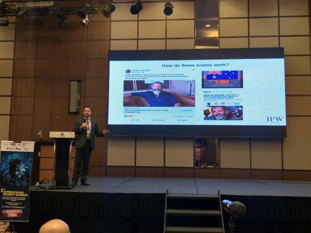Mr Gamble’s talk focused on the results of an IFW Global investigation into highly organised cryptocurrency scammers operating across the world targeting vulnerable investors online while raising hundreds of millions of dollars in criminal profits.